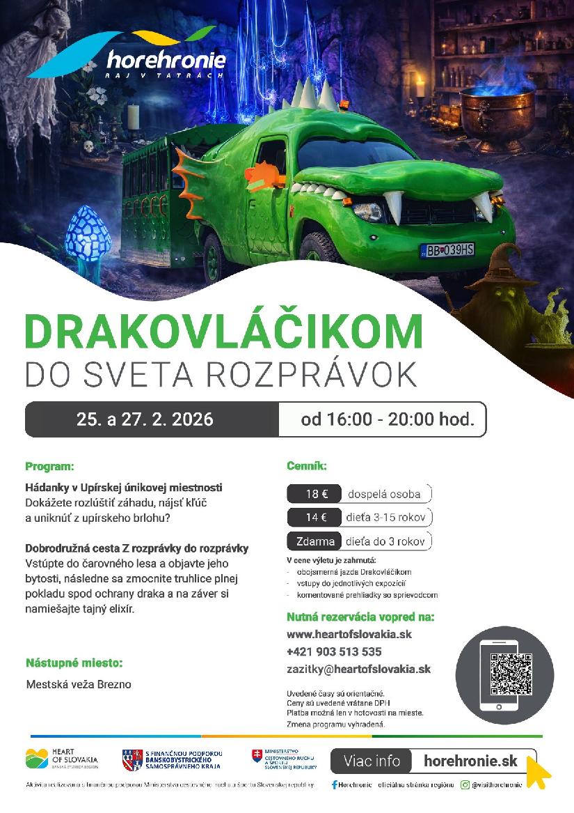 Turistický Drakovláčik vás pozýva na výlet plný rozprávkových bytostí a príbehov, ktorý sa uskutoční v termíne 25. a 27. februára 2026 v čase od 16:00 - 20:00 hod.