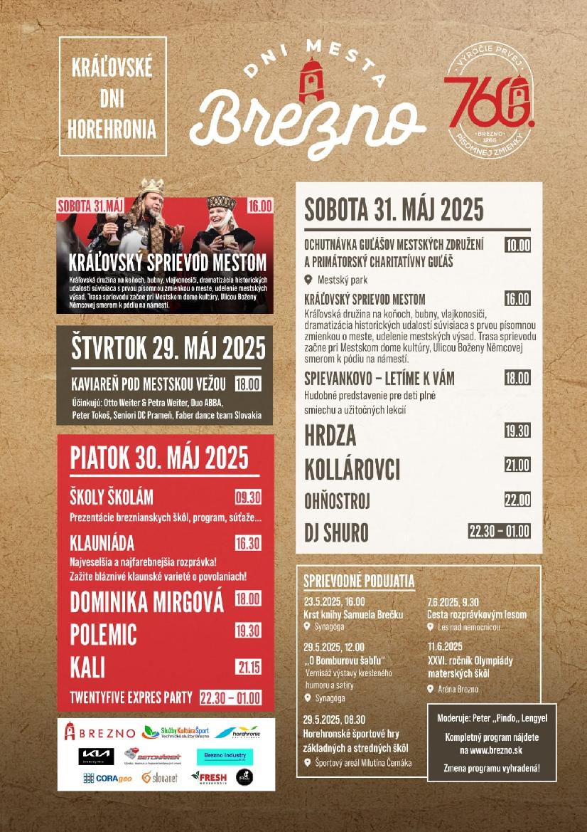 Oslávte s nami 760. výročie prvej písomnej zmienky o Brezne! Počas troch dní vás čaká bohatý kultúrny, hudobný a sprievodný program pre všetky vekové kategórie.