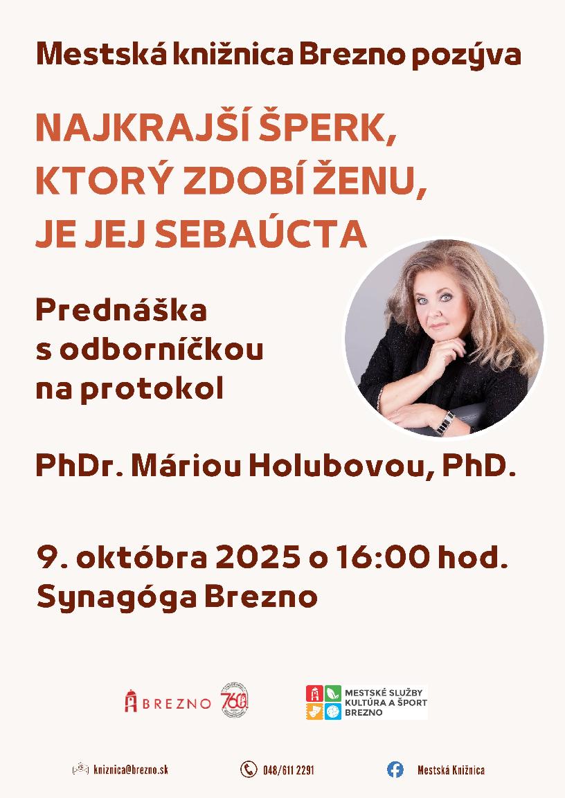 Mestská knižnica Brezno vás srdečne pozýva na inšpiratívnu prednášku s názvom „Najkrajší šperk, ktorý zdobí ženu, je jej sebaúcta“, ktorú povedie renomovaná odborníčka na spoločenský protokol PhDr. Mária Holubová, PhD.