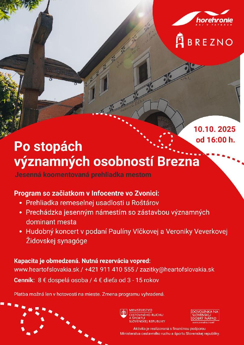 Počas večernej komentovanej prehliadky mesta Brezna, ktorá sa uskutoční dňa 10. októbra 2025 so začiatkom o 16:00 hod., spoznáte najvýznamnejšie postavy politického, literárneho i spoločenského diania. V sprievode lektorov Horehronského múzea v Brezne vdýchneme život do remeselno – roľníckej usadlosti Roštárovcov s historickým mangľom a vyskúšate si remeslo modrotlače priamo v obkolesení usadlosti.