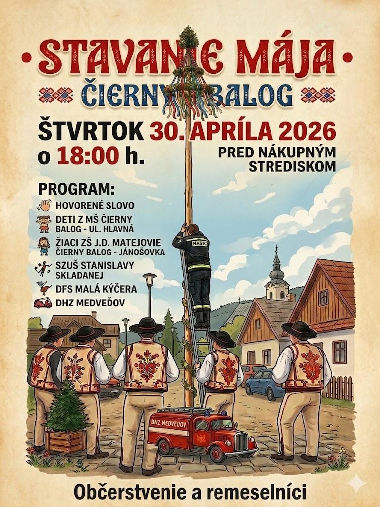 Srdečne vás pozývame na tradičné stavanie mája, ktoré sa uskutoční vo štvrtok 30. apríla 2026 o 18:00 hod. pred nákupným strediskom v Čiernom Balogu.