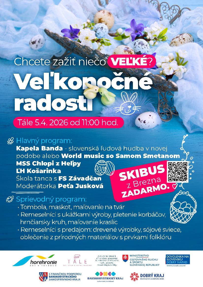 Región Horehronie sa počas veľkonočného obdobia opäť stane miestom plným tradícií, hudby a rodinnej atmosféry. V areáli Tále sa 5. apríla 2026 od 11.00 hod. uskutoční podujatie Veľkonočné radosti, ktoré návštevníkom ponúkne pestrý celodenný program pre všetky generácie.