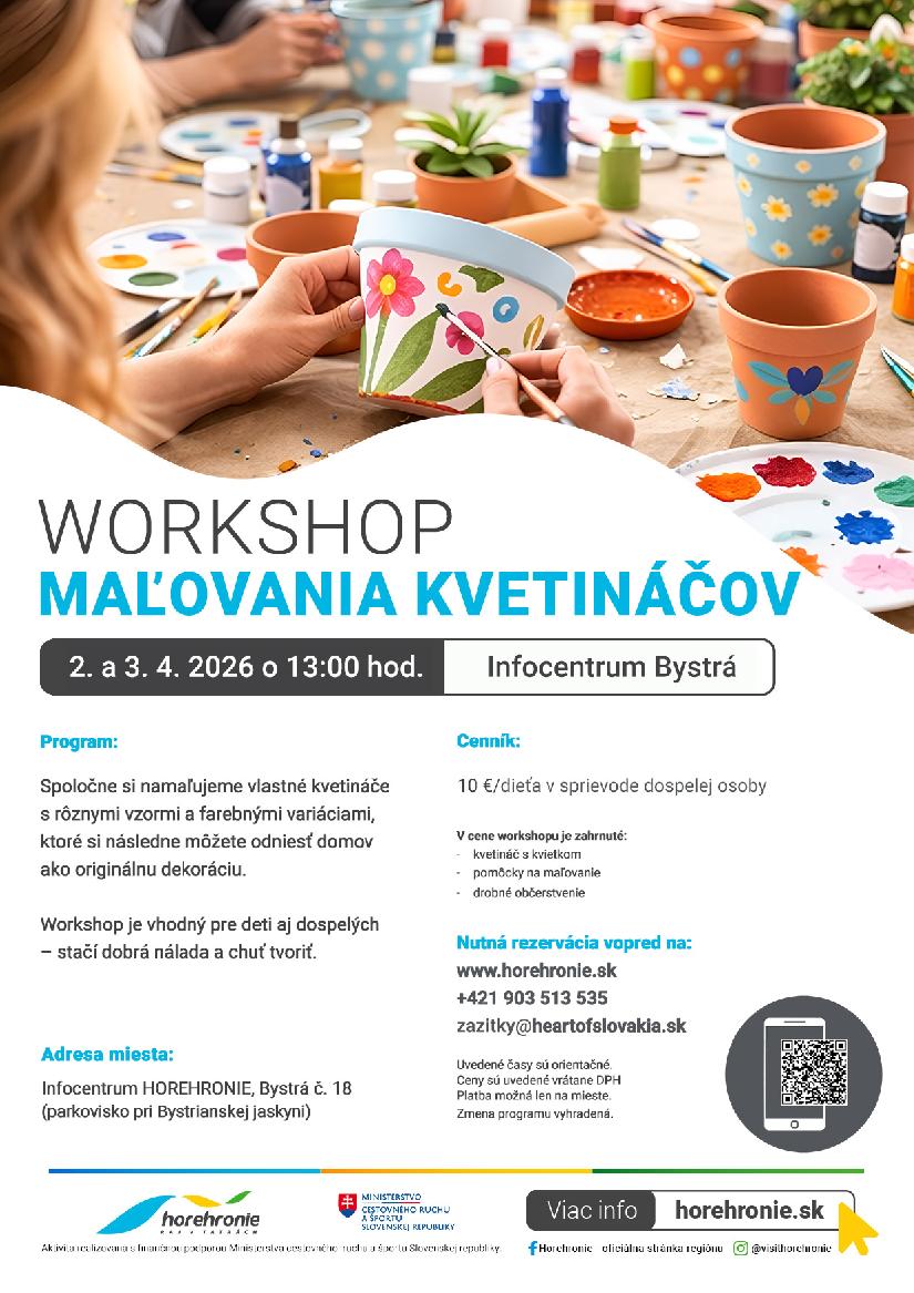 Pozývame vás do Infocentra Bystrá, a to hneď v dvoch termínoch 2. a 3. apríla 2026 o 13:00 hod. na príjemný kreatívny workshop, počas ktorého si budete môcť vlastnoručne ozdobiť a namaľovať svoj originálny kvetináč.